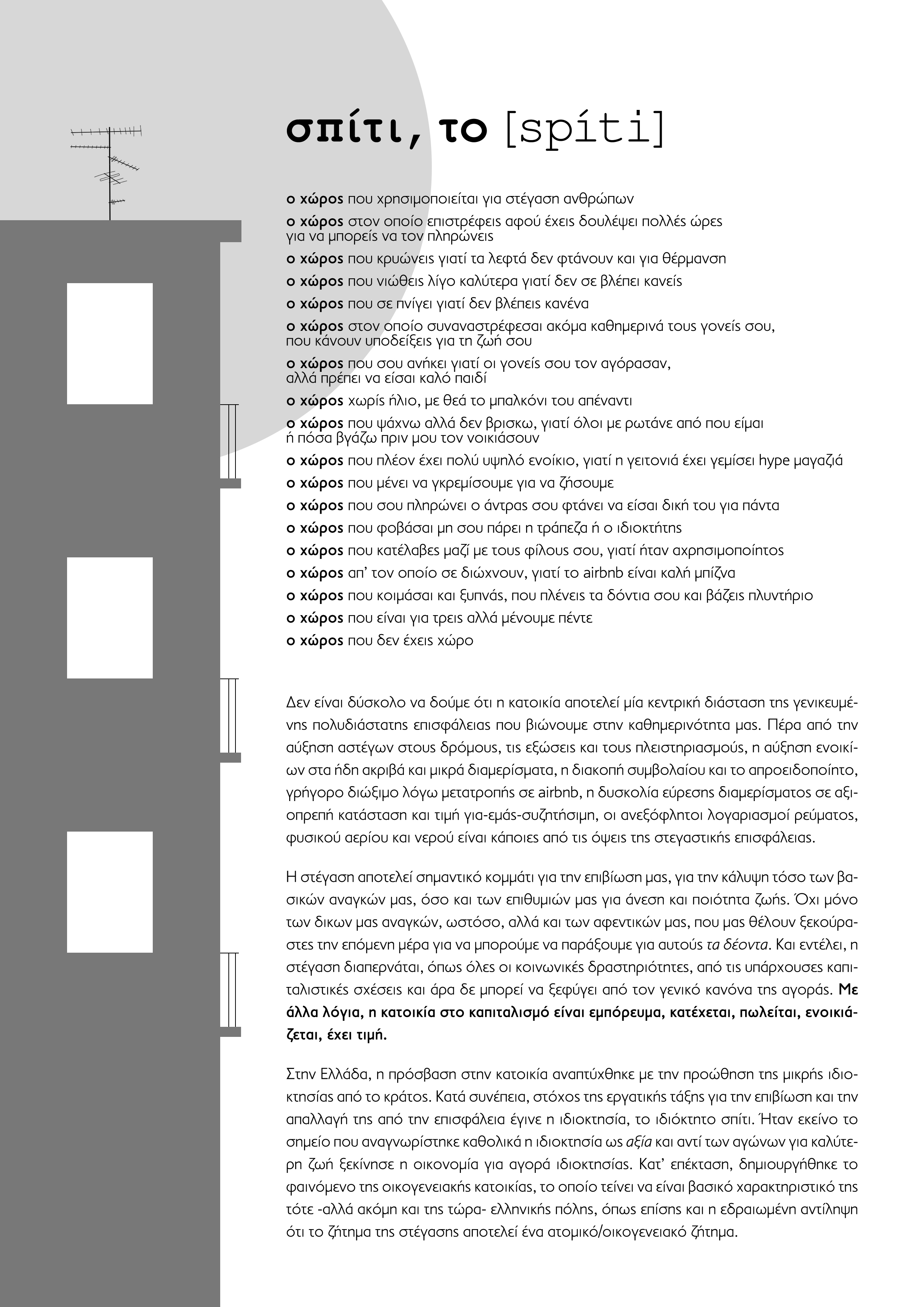 Τα τελευταία χρόνια, εκτός από την αγοραπωλησία μικροϊδιοκτησίας, είδαμε να αναδύεται η μαζική αγορά κατοικιών από ντόπιες ή ακόμα συχνότερα διεθνείς εταιρείες, σε πολυσύχναστες περιοχές ή στις λεγόμενες αναδυόμενες, ως αποτέλεσμα των πλειστηριασμών, της οικονομικής κρίσης και της αύξησης του τουρισμού. Είναι όπως μας λένε οι ιδιοκτήτες των σπιτιών μας, και οι εφημερίδες που διαβάζουν, μεγάλη ευκαιρία η επένδυση στην αγορά ακινήτων αυτή τη στιγμή. Είτε μικροί είτε μεγάλοι ιδιοκτήτες, είτε γνωστοί επιχειρηματίες, είτε σταρτάπερς, όσο αγοράζουν, πωλούν και ενοικιάζουν τα λίγα μας τετραγωνικά ολοένα πιο ακριβά, κάνουν τη μεγάλη ευκαιρία τους έμμεση επίθεση στον μισθό και τον χρόνο μας.