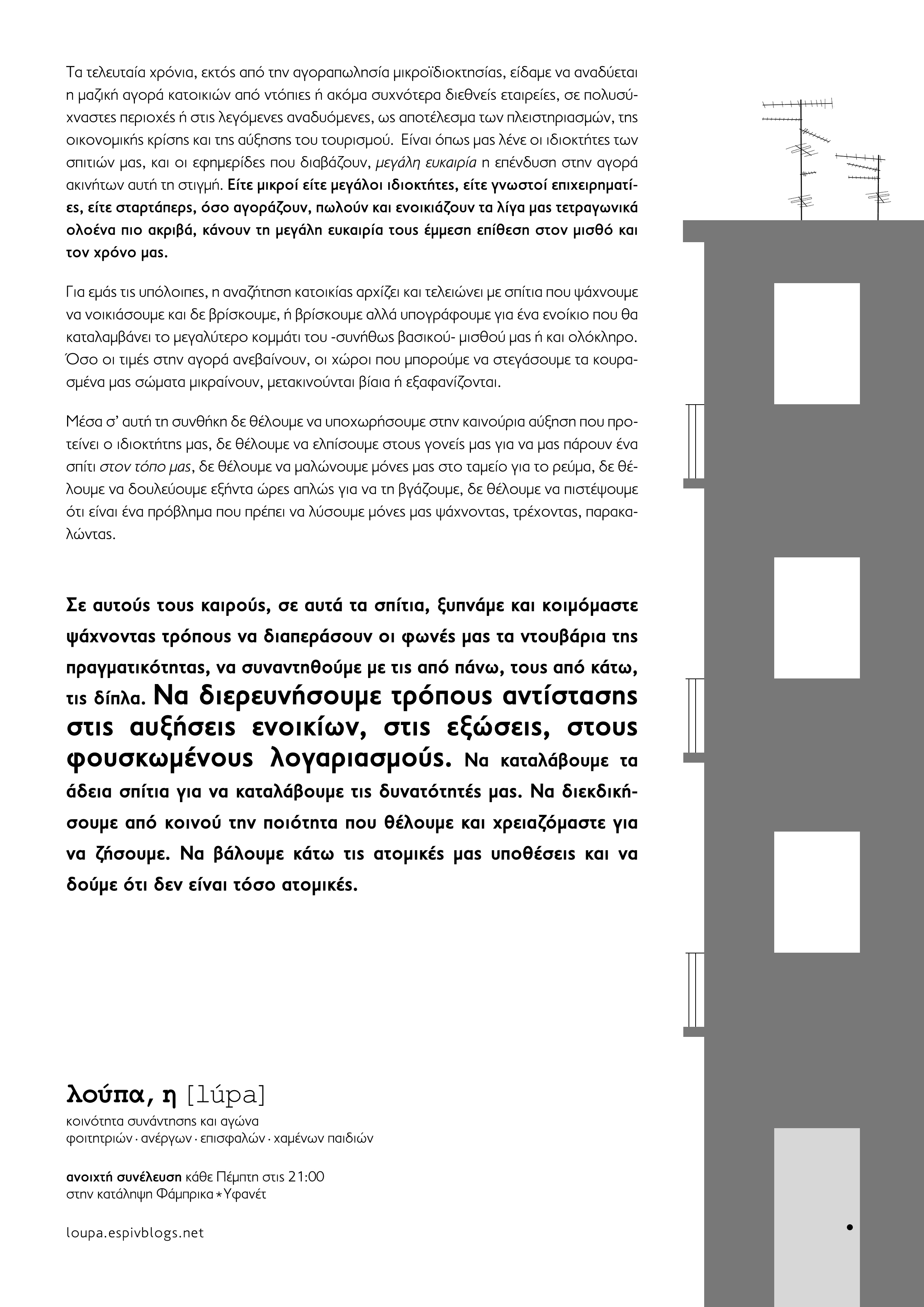 Σε αυτούς τους καιρούς, σε αυτά τα σπίτια, ξυπνάμε και κοιμόμαστε ψάχνοντας τρόπους να διαπεράσουν οι φωνές μας τα ντουβάρια της πραγματικότητας, να συναντηθούμε με τις από πάνω, τους από κάτω, τις δίπλα. Να διερευνήσουμε τρόπους αντίστασης στις αυξήσεις ενοικίων, στις εξώσεις, στους φουσκωμένους λογαριασμούς. Να καταλάβουμε τα άδεια σπίτια για να καταλάβουμε τις δυνατότητές μας. Να διεκδικήσουμε από κοινού την ποιότητα που θέλουμε και χρειαζόμαστε για να ζήσουμε. Να βάλουμε κάτω τις ατομικές μας υποθέσεις και να δούμε ότι δεν είναι τόσο ατομικές.
